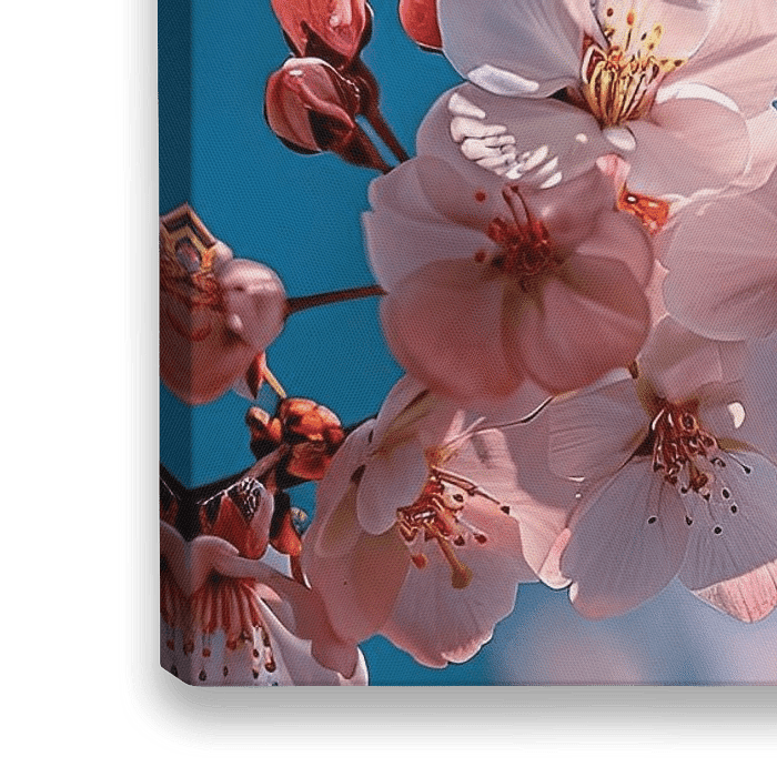 Dieses beruhigende, trendige Kunstwerk ist eine lebendige Darstellung von Kirschblüten in voller Blüte vor einem strahlend blauen Himmel.