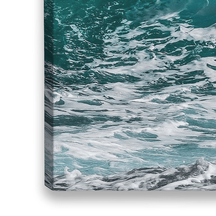 Ein Foto in der turbulenten Brandung des azurblauen Meeres. Das Blau und Türkis vermischt mit dem weißen Schaum macht es zu einem knalligen Hingucker im Haus.