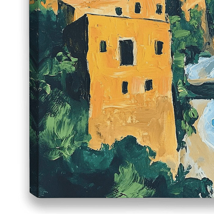 Azure Escape - Dieses Landschaftsgemälde zeigt eine malerische Mittelmeerküste mit farbenfrohen Gebäuden vor einer Kulisse aus steilen Klippen und einem weiten, tiefblauen Meer.