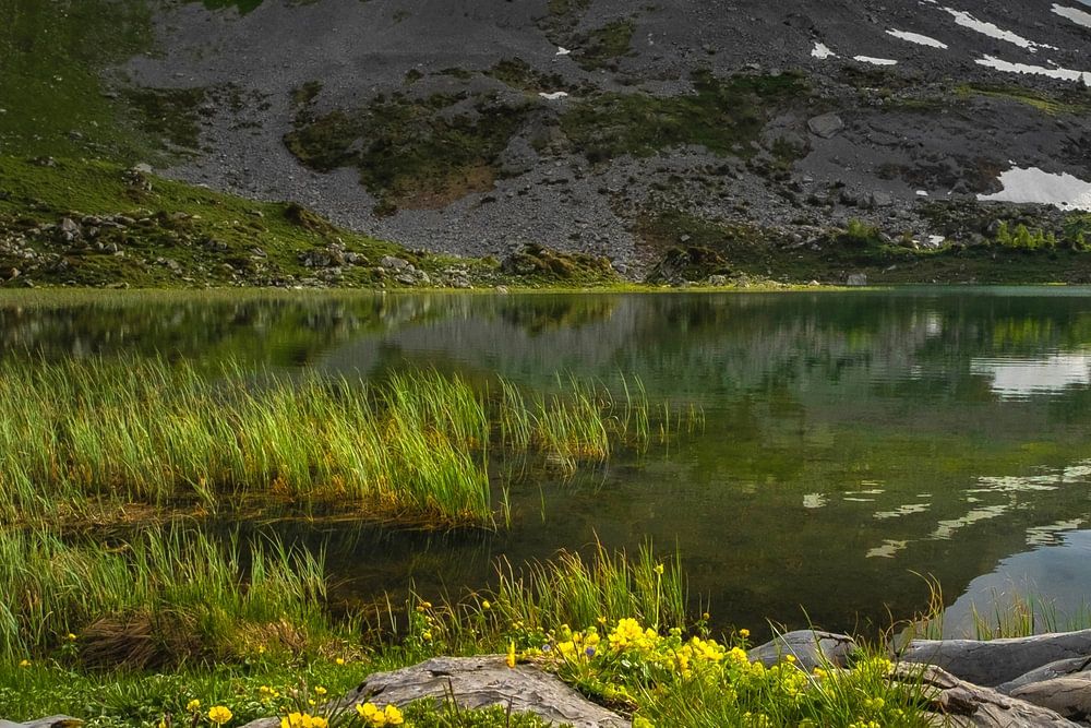Stimmungsvolle Landschaft an einem Bergsee in den Schweizer Alpen.