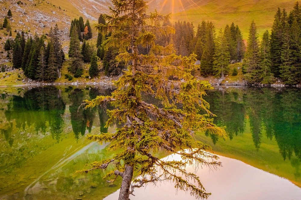 Schöner Bergsee im wunderschönen goldenen Licht der untergehenden Sonne in einem Naturpark der Schweizer Alpen.