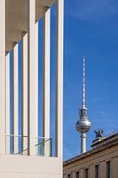 Der Berliner Fernsehturm ist mit 368 Metern das höchste Bauwerk Deutschlands und prägt als weit sichtbares Bauwerk die Skyline Berlins. Er ist ein bekanntes Wahrzeichen der Stadt. Hier mit der Fassade der James-Simon-Galerie und dem Alten Museum zu sehen.