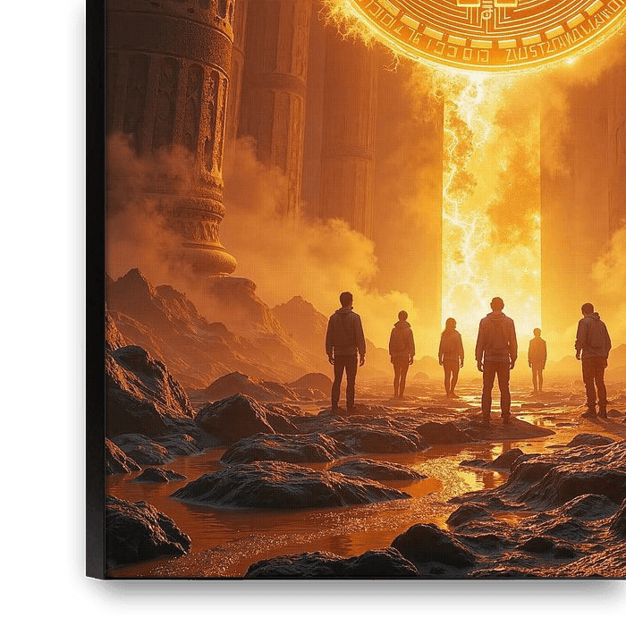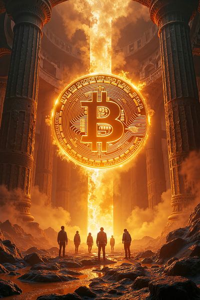 Tief im Inneren eines monumentalen Tempels aus gewaltigen Säulen und uralten Steinstrukturen entfaltet sich eine Szene von überwältigender Kraft. Aus dem Zentrum des Heiligtums bricht ein gleißender Lichtstrahl hervor, der eine strahlende Bitcoin-Münze in goldenem Feuer erscheinen lässt. Die Luft ist erfüllt von flammendem Glanz,…