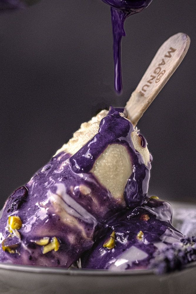 Für eine Herausforderung zum Thema Farbe PAARS habe ich dieses Foto von weißem Schokoladeneis gemacht, das ich in eine köstliche Blaubeer-Ganache getaucht habe, die für die tiefviolette Farbe sorgte.