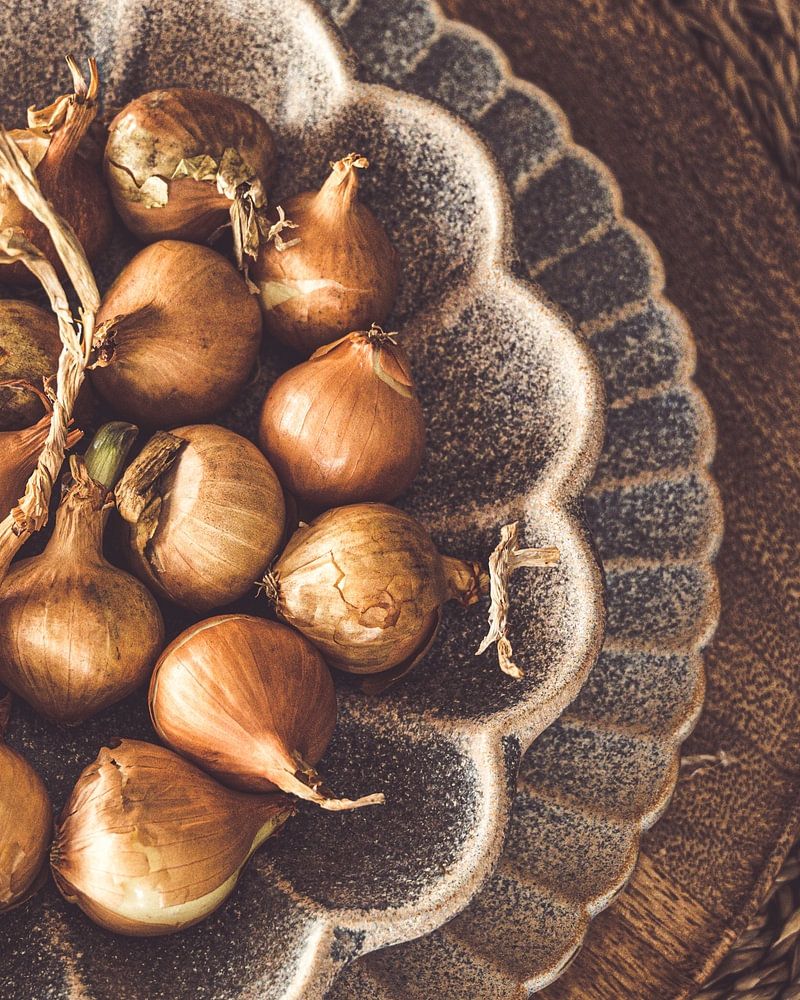Eine Kombination aus Babyzwiebeln und Knoblauch auf einem hübschen Landgericht. Warme, weiche Farben auf einem rustikalen, rostbraunen Hintergrund in einer dunklen & stimmungsvollen Atmosphäre.