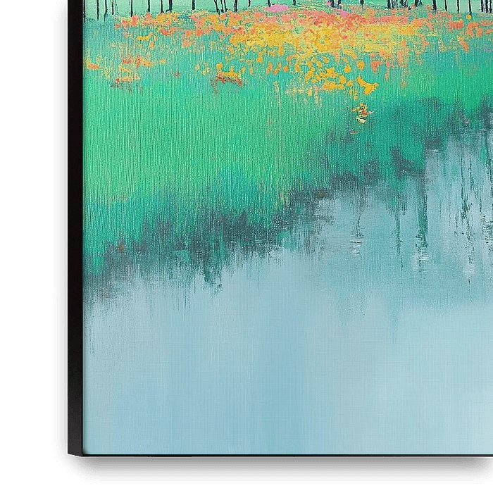 Beekje Dawn - In het midden van het doek trekt een zacht kronkelend beekje de aandacht — een brede, spiegelgladde baan water die het landschap in twee ademt en de lucht bijna vloeiend teruggeeft. Rondom die waterloop speelt zich het meest markante tafereel af: een rij slanke bomen aan de linkerkant, als grafische lijnen die omhoog…