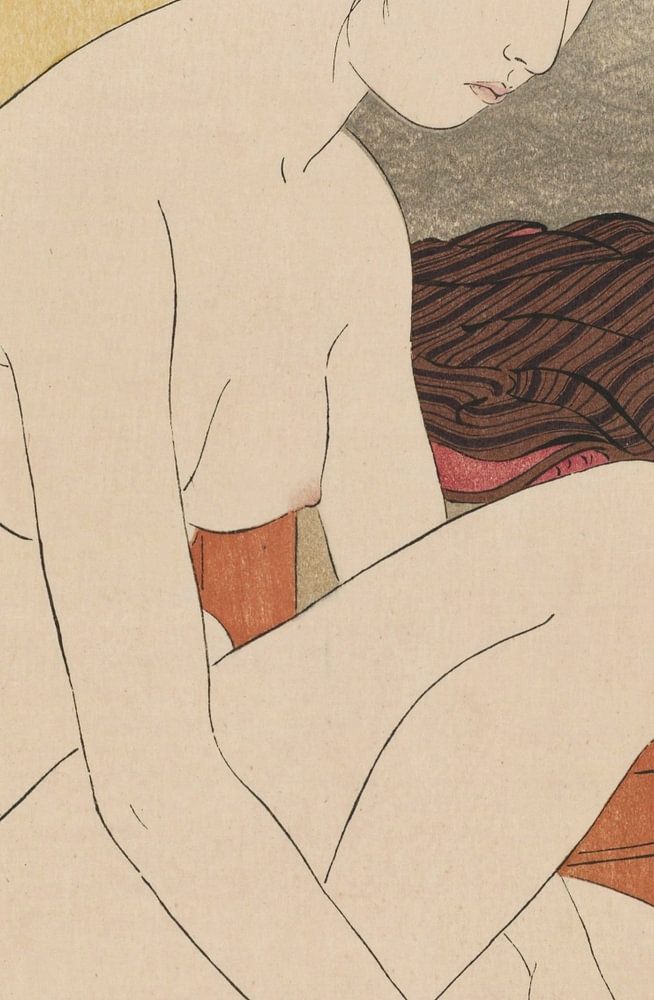 Diese Badende sitzt nackt auf dem Boden und ist mit ihrem japanischen Ritual des Badens beschäftigt. Da das Mädchen unbekleidet ist, steht sie als Aktmodell auf einem Aktportrait. Das Modell steht mit Beinen, Hüfte, Torso und Brüsten auf dem Kunstwerk durch.