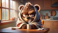 Ein großer Bär, eingehüllt in eine Decke, sitzt müde am Küchentisch und hält eine Kaffeetasse fest. Er ist der Inbegriff des Morgenmuffels, seine Augenlider scheinen jeden Moment zufallen zu können, und das warme Licht, das durch das Fenster strömt, kann seine Müdigkeit nicht vertreiben. Die Küche wirkt einladend und wohnlich, doch der…