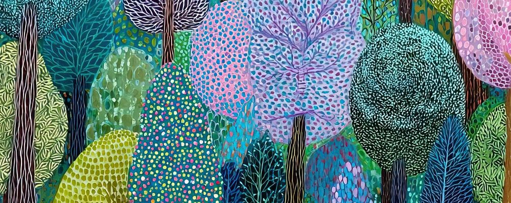 Trees Colours | Tree Vibes - Dies ist ein farbenfrohes Gemälde von Bäumen mit verschiedenen Blattformen und leuchtenden Farben, die das Gefühl eines dichten Waldes mit einem spielerischen, modernen Stil hervorrufen.