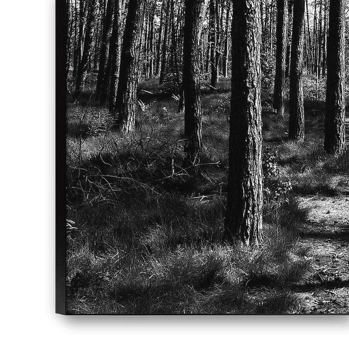 Schwarz-Weiß-Fotografie eines Waldes. Ein kontrastreiches Bild mit einem Spiel von Linien und Schatten.