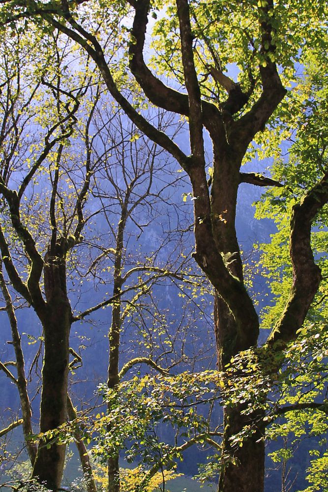 Sonnenschein durch Bäume am Koningssee bei Berchtesgaden in Deutschland.