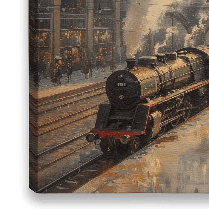 Bestelle diese Malerei Bahnhof mit Dampfzug von Kees van den Burg als Reproduktion auf Leinwand, Alu-Dibond, als Poster, Fototapete oder Acrylglasbild.