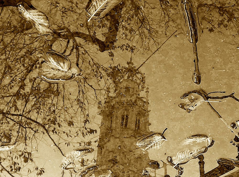 Dies ist ein Bild der vielleicht schönsten Türme Haarlems, die sich in einem Regenwasserbecken spiegeln, der Turm der Bakenesserkerk an der Vrouwestraat 12. Diese mittelalterliche Kirche ist jetzt zum größten Teil Büro und Ausstellungsraum des Archäologiebüros der Stadt.