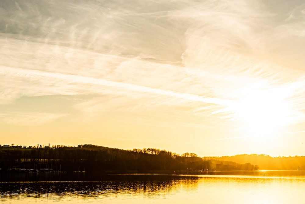Baldeneysee in Essen mit Schwan im Winter im Gegenlicht bei Sonnenuntergang