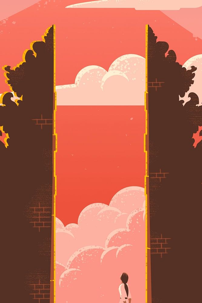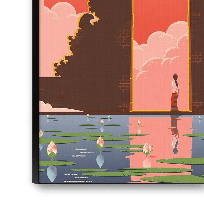 Diese Illustration ist von dem bekannten Tor zum Himmel am Lempuyang-Tempel auf Bali, Indonesien, inspiriert. Zwischen den beiden hohen Toren erscheint der Vulkan Agung in der Ferne, umgeben von Nebel und Mondlicht. Im Vordergrund treiben Seerosen auf blauem Wasser, während zarte Rosatöne den Himmel färben. Eine balinesische Frau blickt zum Mond hinauf – ein Moment der Stille und des Staunens.