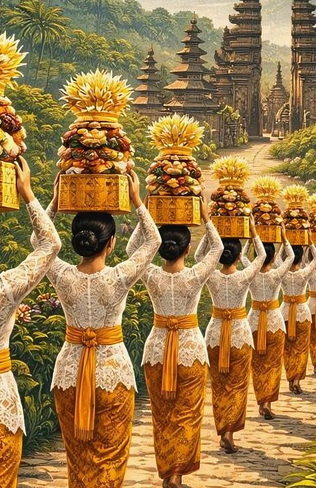 Bestelle diese Illustration Balinesische Tempel-Opferprozession von Dodik Hariyono als Reproduktion auf Leinwand, Alu-Dibond, als Poster, Fototapete oder Acrylglasbild.