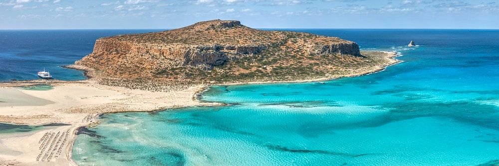 Der Strand liegt im Westen der Insel an der türkis leuchtenden Lagune von Balos mit kristallklarem Wasser und einer schönen naturbelassenen Landschaft. Panorama Landschaftsbild 310182ays