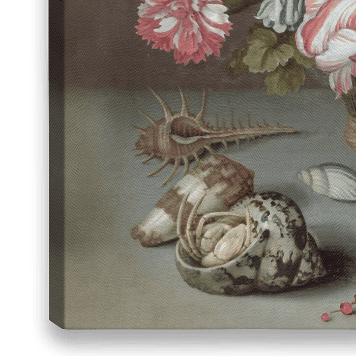Blumen-Stillleben mit Früchten und Muscheln, von Balthasar van der Ast, Blumenkorb, Original von 1622, digital bearbeitet und veredelt