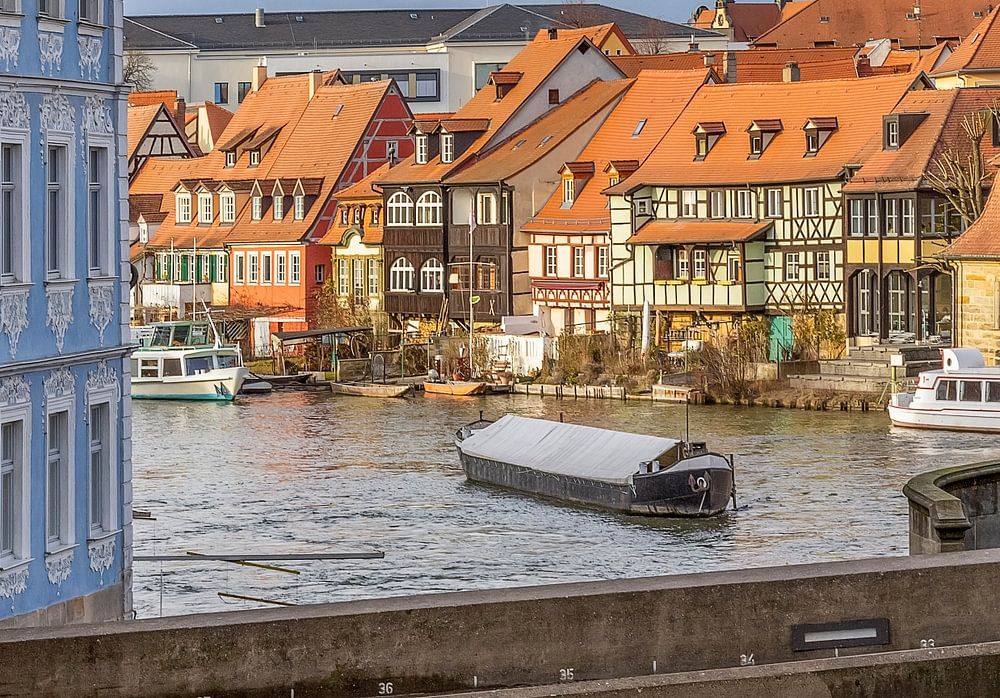 Idyllische Flusslandschaft in Bamberg, einer Stadt in Oberfranken, Deutschland