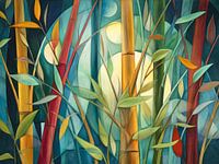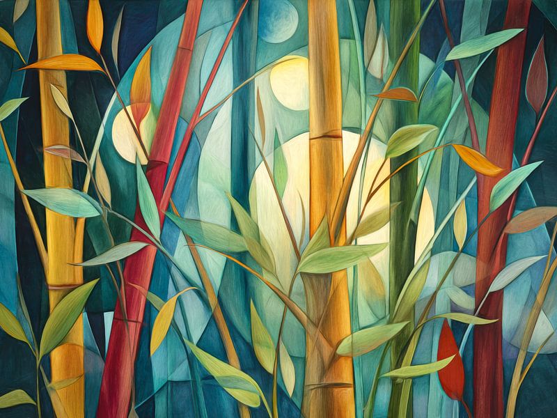 Leuchtende Bambusstängel in verschiedenen Rot-, Grün- und Gelbtönen füllen das Bild vor einem Hintergrund aus sich überlappenden Kreisen, die an Monde erinnern. Die Komposition erzeugt eine lebendige und zugleich friedvolle Waldatmosphäre bei Nacht.