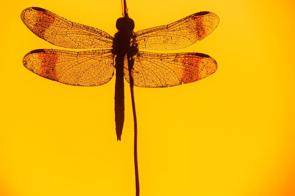 Beschauliche Bänderung, fotografiert im Gegenlicht der aufgehenden Sonne. An den Flügeln sind Tautropfen sichtbar.