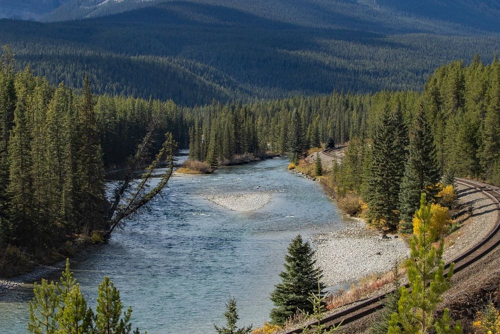 Der Banff-Nationalpark in den Rocky Mountains ist eine der bekanntesten Sehenswürdigkeiten Kanadas. Sie können ihn mit dem Auto, dem Fahrrad und dem Zug durchqueren. Ein berühmter Ort ist Morants Curve, wo sich der felsige Bergsteiger durch die kanadische Landschaft schlängelt.