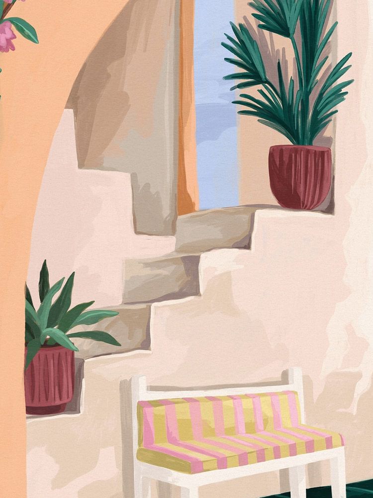 Wir lieben farbenfrohe Illustrationen, die einen aufmuntern und zum Träumen anregen. Mediterrane Sphären sind dann gerne unsere Inspiration mit einem schönen botanischen Hintergrund. Diese Illustration ist eine schöne Aussicht auf das Meer.