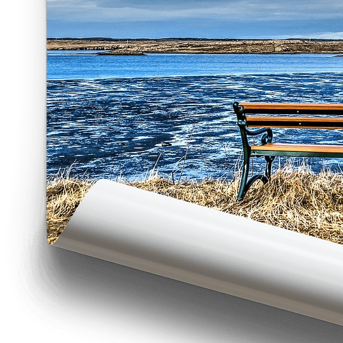 Es ist ein Bild, das die Ruhe zum Platzen bringt... Ein Bankchen am Rande einer Klippe in Borgarnes an der Westküste Islands mit Blick auf eine teilweise trockene Flussmündung und in der Ferne die Berge von Snaefellsnes.
