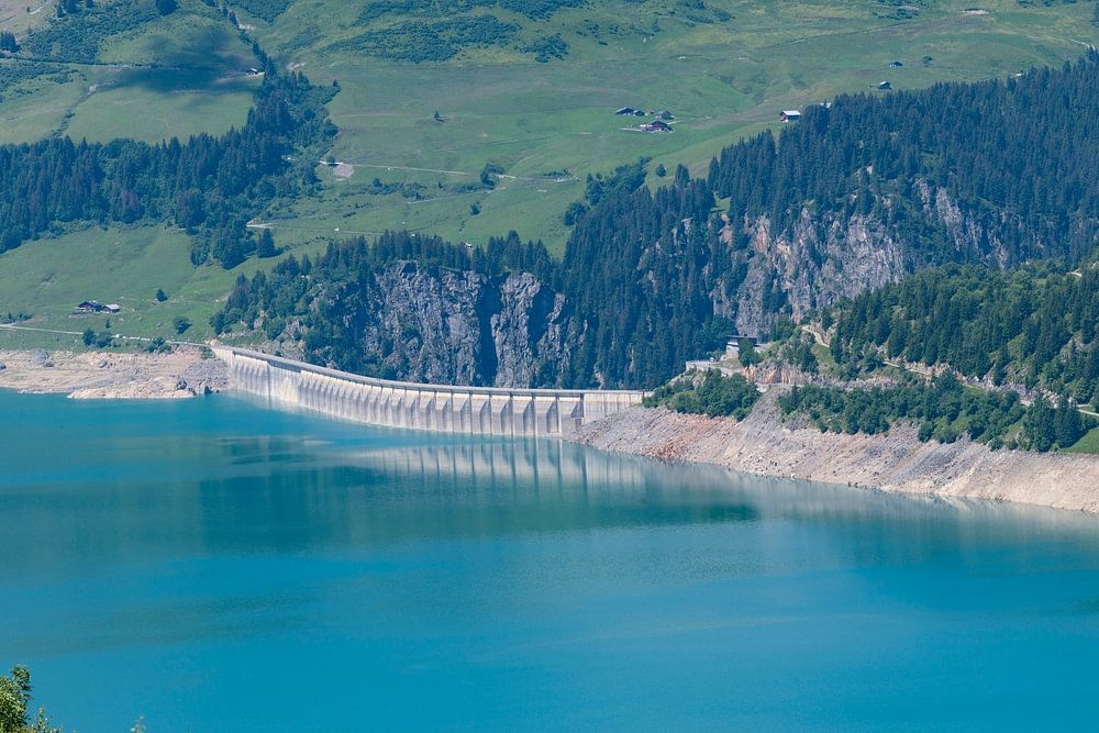 Azurblaues Wasser im Stausee Lac de Roselend. Hoch oben in den französischen Alpen haben Sie einen Blick auf das Wasser und die Staumauer.