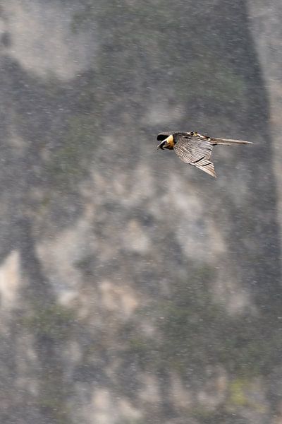 Der größte flugfähige Vogel Europas: der Bartgeier. Aufgenommen im Schnee und in der Kälte. Cevennen. Frankreich. Foto aufgenommen mit 500 mm F4 unter schwierigen Bedingungen. Trotzdem kommen seine Farben gut zur Geltung, zwischen dem ockerfarbenen'seines Kopfes und seinen großen, dunklen, fast metallisch schimmernden Flügeln.
