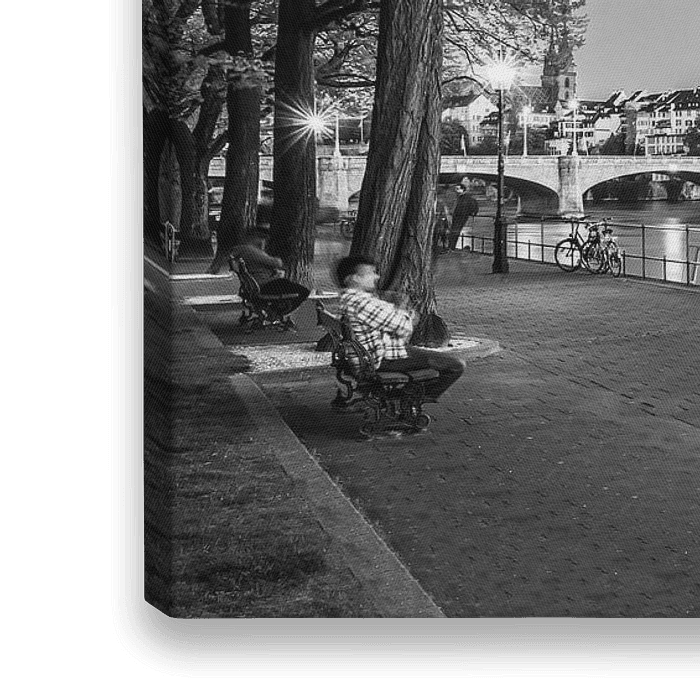 Schwarzweißfotografie Fahrräder an der Uferpromenade und Blick über den Rhein und auf die Mittlere Rheinbrücke, Altstadt, Basel, Kanton Basel-Stadt, Schweiz