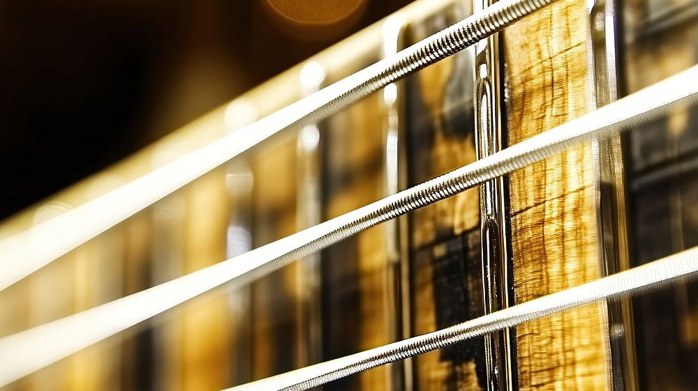 Eine Nahaufnahme der Saiten und des Griffbretts einer Bassgitarre fängt die Essenz von Jazzmusik ein. Die warme, einladende Beleuchtung erzeugt eine intime und authentische Stimmung, die an die vibrierende Atmosphäre eines Jazzclubs erinnert. Der verschwommene Hintergrund deutet auf einen lebendigen Raum voller Musik und Emotionen hin, während die feinen Details der Saiten und des Instruments die Kunstfertigkeit und Leidenschaft der Musik betonen. Dieses Bild ist ideal, um die Schönheit und Magie des Jazzlebens zu feiern und Musikliebhaber zu begeistern.