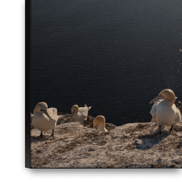 Bestelle das Foto Basstölpel mit untergehender Sonne von Johannes Jongsma als Reproduktion auf Leinwand, Alu-Dibond, als Poster, Fototapete oder Acrylglasbild.