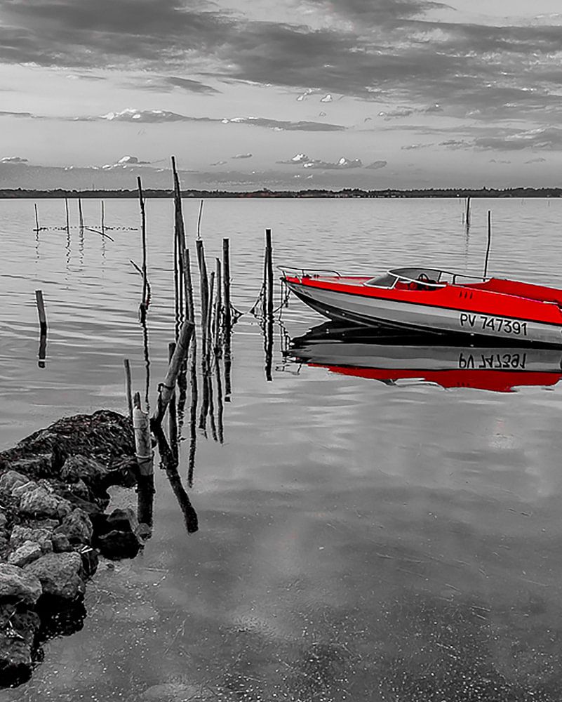 Bateau de pêcheur en stationnement sur l'étang de Bages en Occitanie, photographie noir et blanc avec couleur sélective