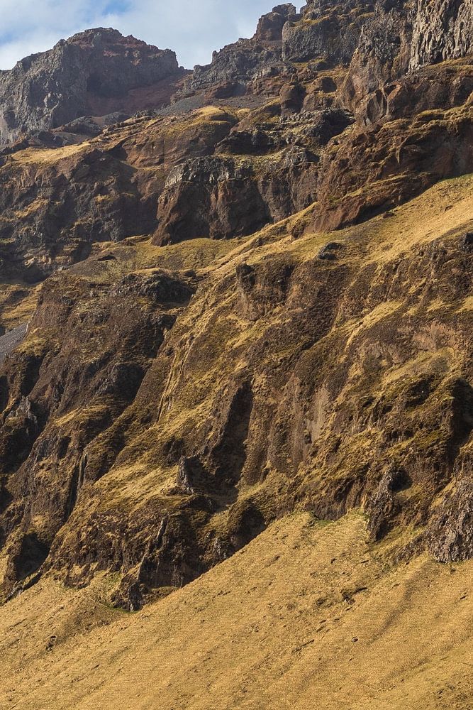 In diesem Werk sehen Sie ein einsames weißes Bauernhaus mit rotem Dach, das am Fuße eines imposanten Berghangs liegt. Die Landschaft wird von schroffen Felsen und weichen, goldgelben Grashängen beherrscht, während über allem ein klarer blauer Himmel strahlt. Hier scheint der Mensch nur ein bescheidener Gast in einer Welt zu sein, die seit Jahrhunderten unberührt geblieben ist.