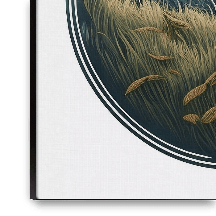 Das Bild zeigt ein kreisförmiges Landschaftsmotiv mit zerklüfteten, niedrigen Bergen im Hintergrund und einem grasbewachsenen Vordergrund mit komplizierten Details. Das Gras biegt sich und wiegt sich sanft, was an eine leichte Brise erinnert. Verschwommene Halme und verstreute, gefallene Blätter verleihen der Szene Textur und Bewegung.…