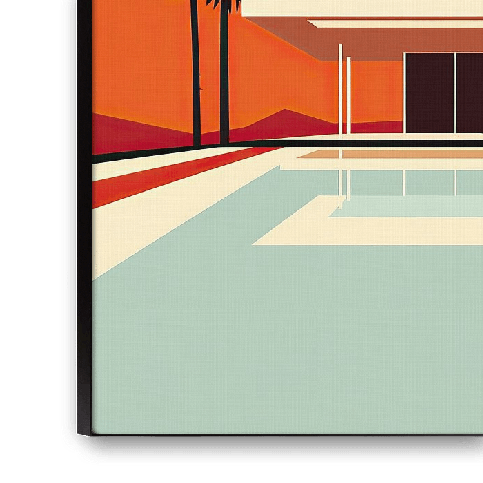 Eine minimalistische Vektor-Illustration eines architektonischen Hauses im Stil des Bauhauses, auf der rechten Seite gibt es eine Reflexion von Wasser und dahinter steht eine Palme, auf der oberen linken Ecke des Bildes ist ein orangefarbener Himmel mit einigen Wolken, die ganze Szene hat flache Farben, einfache Formen und keine Gradienten oder Schatten. Die Gesamtstimmung sollte ruhig und friedlich sein und die Einfachheit und Eleganz der Architektur widerspiegeln.