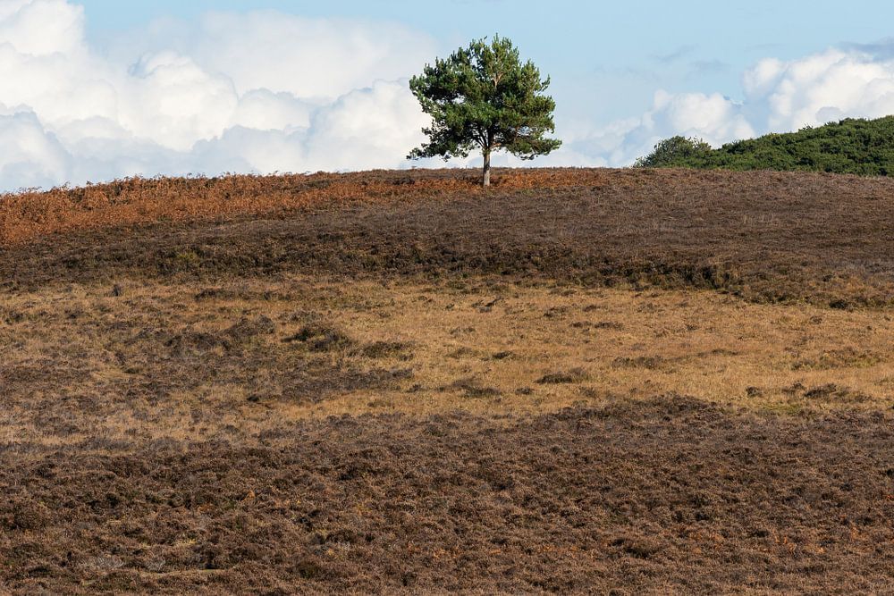 Alleiner Tannenbaum im neuen Wald mit drei Pferden auf der Heide im Herbst, England.
