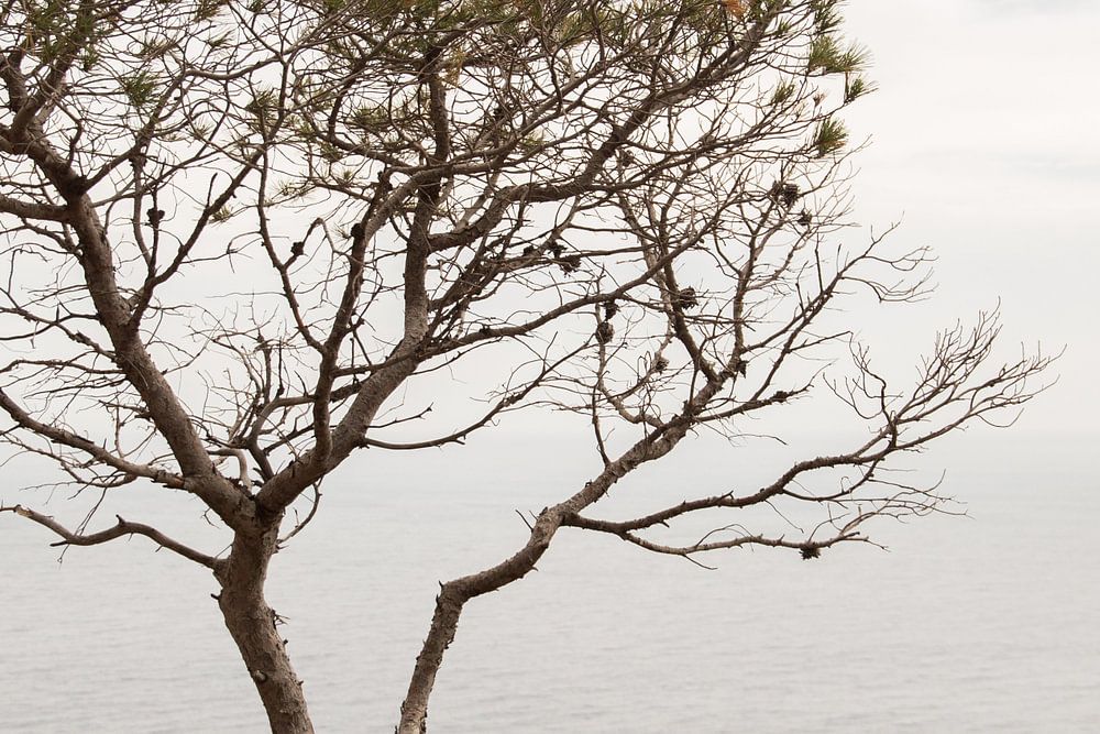 Beruhigendes Bild eines Baumes, der auf einem Felsen wächst, der über das Mittelmeer hinausragt. Stellen Sie sich die Côte d'Azur vor!