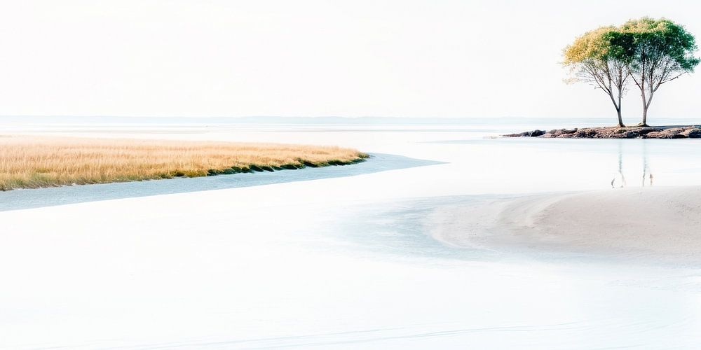 Ein einsamer Baum steht auf einer kleinen Insel, umgeben von ruhigem Wasser. Die weite Fläche aus Sand und Himmel schafft eine ruhige und minimalistische Landschaft. Die Szene vermittelt mit der künstlerischen Betonung von hellen Tonwerten ein Gefühl von Ruhe und Einsamkeit......Digitalart-Bild, Design und Composing durch mich, Visualisierung mit KI