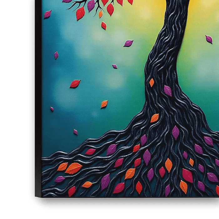 Der türkisfarbene Hintergrund bildet einen beruhigenden Kontrast und unterstreicht die satten, feurigen Farben der Blätter. Jedes Element, von den gewundenen Wurzeln bis zur strahlenden Mitte, bildet ein dynamisches Spiel aus Licht, Textur und Farbe, das die Fantasie anregt.