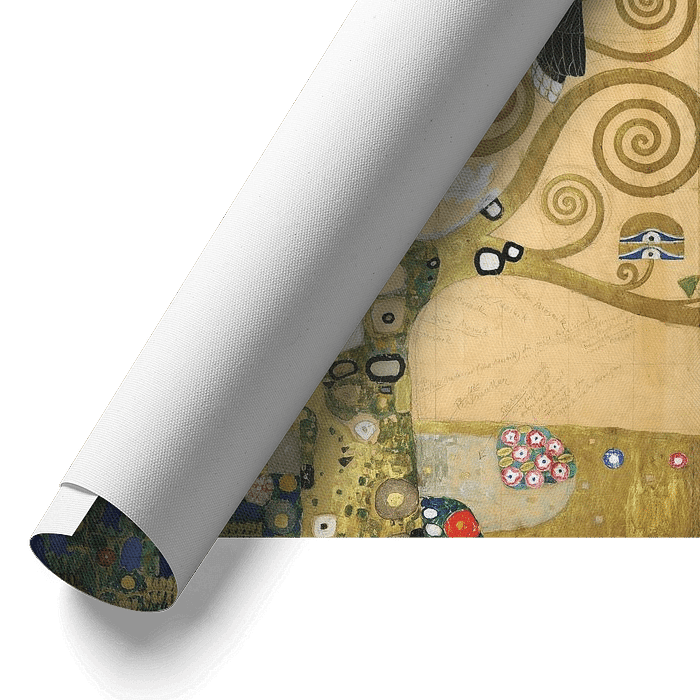 Lebensbaum, Gustav Klimt Teil der neun Karikaturen für die Ausführung eines Frieses für den Speisesaal des Stoclet-Hauses in Brüssel Das zentrale Motiv des gesamten Frieses ist der ausladende Lebensbaum, der sich von der Mitte aus über die gesamte Längsseite des Speisesaals des Stoclet-Hauses erstreckt. Inspiriert vom byzantinischen Formenkanon ist die radikale Stilisierung des Baumes mit seinen weit ausladenden volutenartigen Ästen voller Symbolik. Die goldenen Voluten tragen Horusfalken und Horusaugen sowie stark stilisierte Blüten und Blätter und wurden wahrscheinlich von der altägyptischen, antiken und byzantinischen Sammlung der Stoclets inspiriert. Die gesamte Komposition spiegelte sich in dem Mosaik an der gegenüberliegenden Wand wider, wobei das Motiv Erwartung auf der westlichen und das Motiv Erfüllung auf der östlichen Seite integriert wurde. Auf diesen Werkzeichnungen fügte Klimt zusätzliche handschriftliche Erläuterungen zur Herstellung des Frieses hinzu.