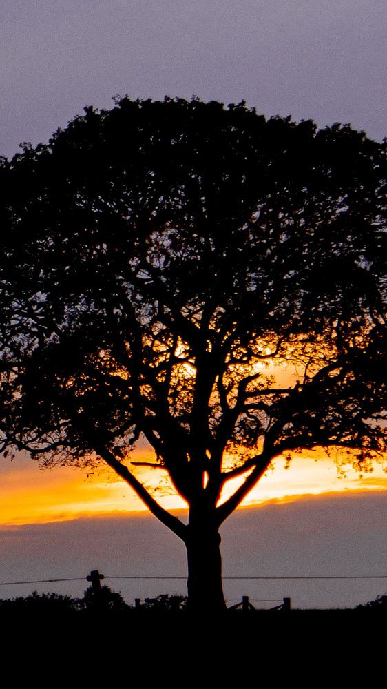 Eine Silhouette eines Baumes mit dem Sonnenuntergang im Hintergrund.