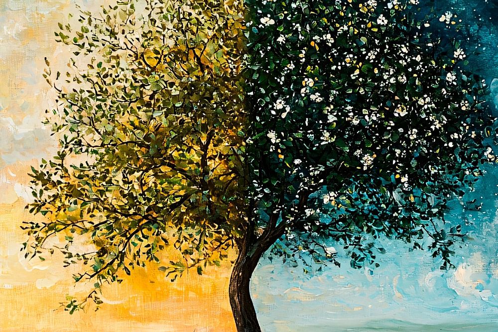 Diese einzigartige Wanddekoration zeigt einen schönen Kontrast zwischen Tag und Nacht, mit einem majestätischen Baum in der Mitte eines farbenfrohen Feldes. Die warmen Farbtöne des Sonnenaufgangs auf der einen Seite gehen harmonisch in die mystische Kühle des Sternenhimmels auf der anderen Seite über. Das Gemälde bringt ein Gefühl von Ausgeglichenheit und natürlicher Schönheit in jeden Raum. Perfekt, um Ihrem Wohn- oder Esszimmer eine besondere Atmosphäre zu verleihen. Lassen Sie sich von der Kombination aus Licht und Dunkelheit in diesem atemberaubenden Kunstwerk inspirieren.