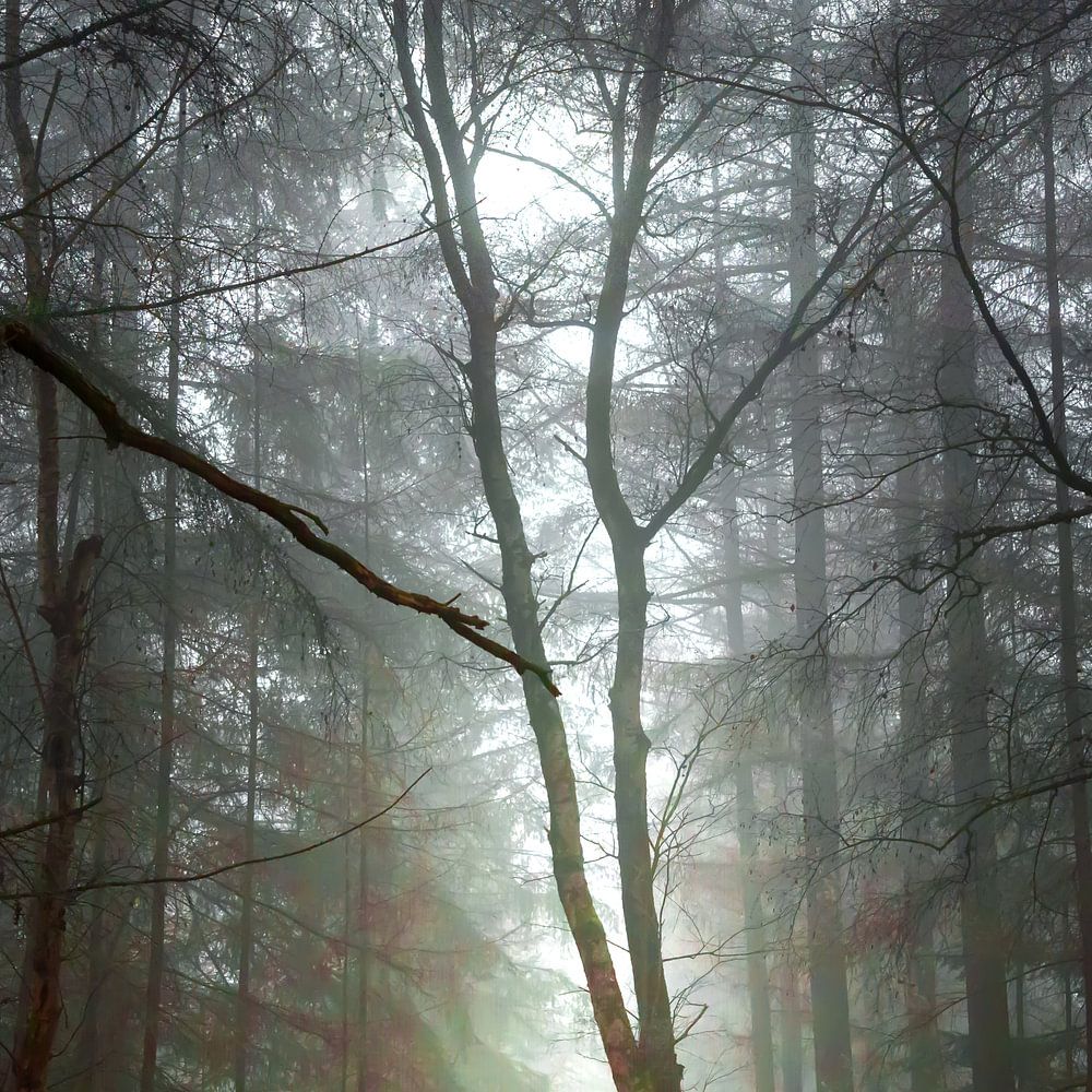 Ein etwas nebliger Waldblick auf den Wald bei Rechteren, Herbst. Dieses Foto wurde in den Sterrenbos bei Hoonhorst (Overijssel) aufgenommen. Es besteht aus einem Panorama von 3 Bildern.