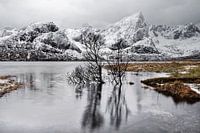 Bäume stehen im Wasser, markante Spiegelung, Eislandschaft mit Bergen im Hintergrund, grauer Himmel - Location: Norwegen, Lofoten