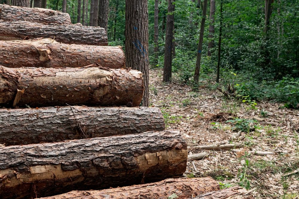Genk Limburg Belgien Aufgestapeltes Holz in einem Wald. Wald, Holz, Bäume, Stämme, Bäume, Stämme, Holz, Hoge Kempen National Park