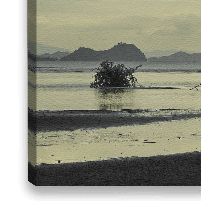 Große Baumwurzeln liegen malerisch am Strand bei Niedrigwasser, im Hintergrund eine Bergkette, Abendlicht, Spiegelungen - Location: Indonesien, Insel Flores