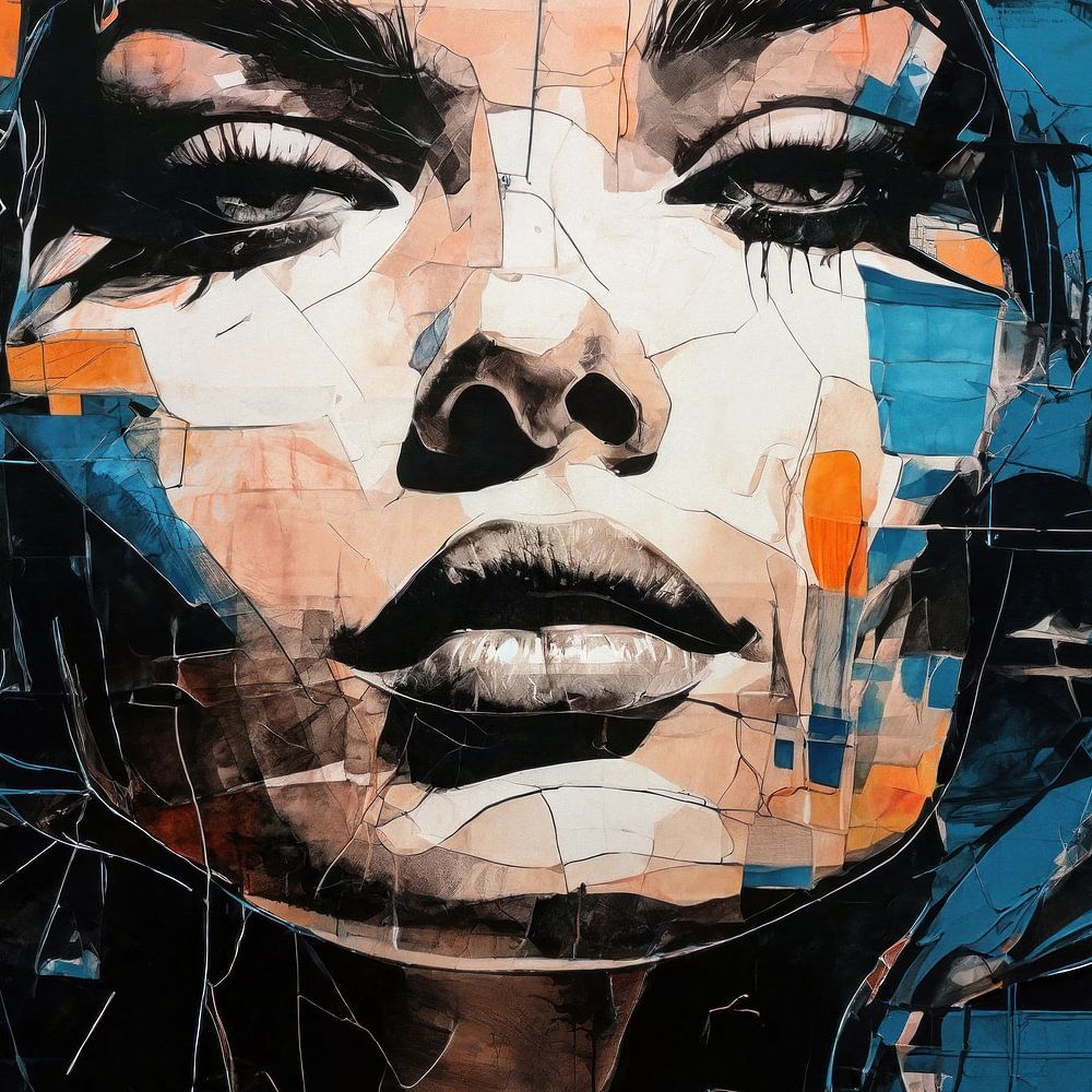 Dieses moderne Kunstwerk zeigt das Porträt einer Dame aus den 60er Jahren, gehalten in den Farben Orange, Türkis-blau und Schwarz. Das Bild strahlt eine zeitlose Eleganz aus, während die kräftigen Farben eine gewisse Lebendigkeit verleihen. Die Dame auf dem Gemälde scheint in Gedanken versunken zu sein, ihr Blick voller Geheimnisse und ihre Haltung von einer gewissen Coolness geprägt. Die Kombination der Farben verleiht dem Porträt eine moderne und gleichzeitig nostalgische Atmosphäre, die den Betrachter in vergangene Zeiten entführt.