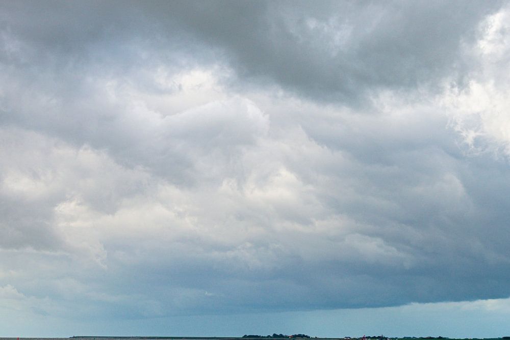 Über dem stürmischen Wattenmeer bei Ameland sieht man die bedrohlichen Wolken eines herannahenden Schauers. Typisch für das niederländische Wetter.